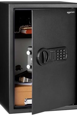 Amazon Basics Steel Security Safe and Lock Box with Electronic Keypad – Secure Cash, Jewelry, ID Documents, 0.5 Cubic Feet, Black, 13.8″ W x 9.8″ D x 9.8″ H