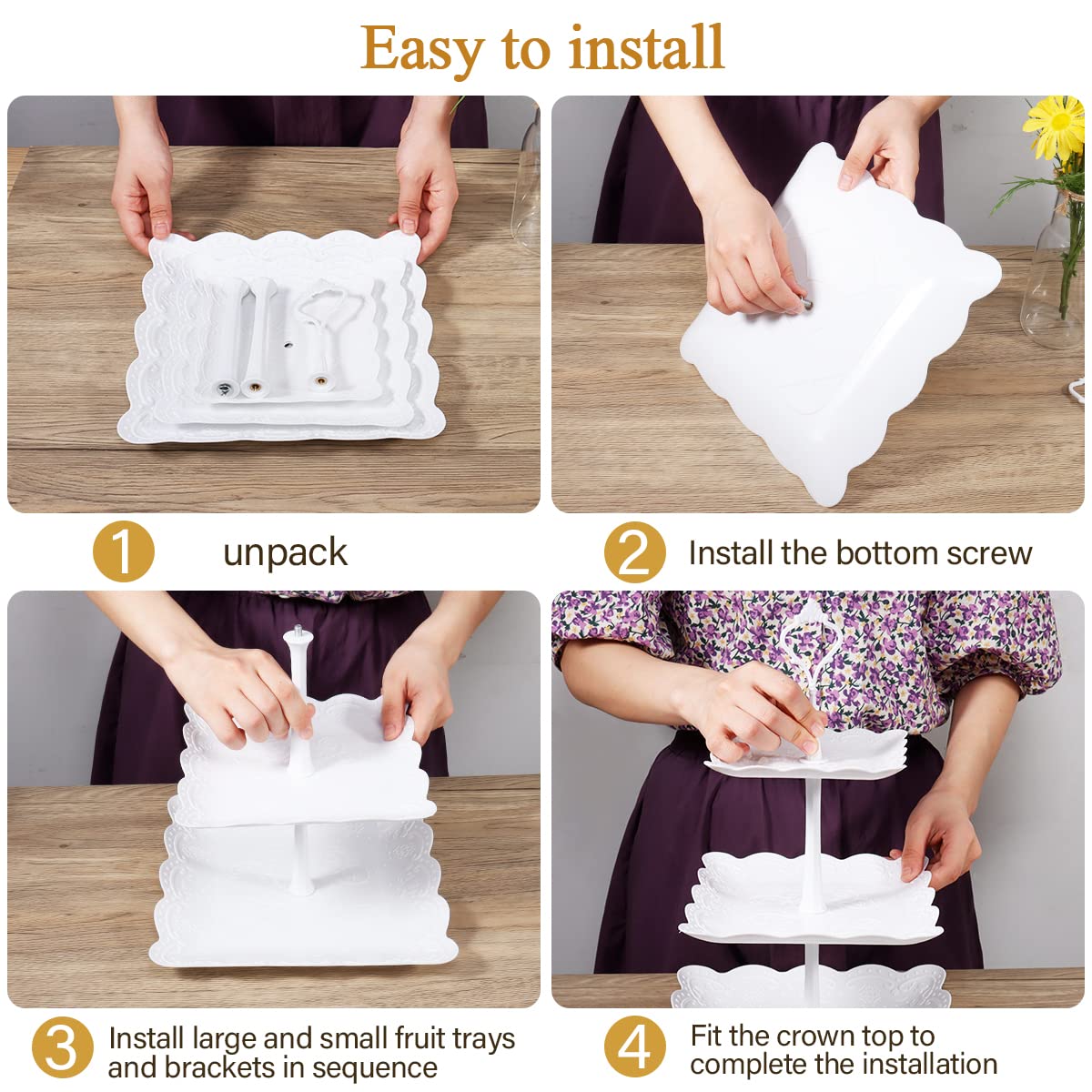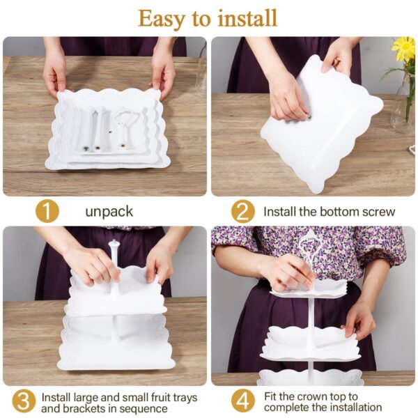 - High-Stability: Our tiered cupcake tower are made of extra thick reusable plastic, extra large tray and extra thick posts provide superior texture and stability. And the parts are carefully selected and inspected for no missing or mismatched components. NOTE: The whole tiered cupcake stand connects the tiers with solid posts and screws, easy to assemble, no tools required. When installing the bottom tray, the nuts should be fixed and pressed tightly, the support rods connected to them can be installed more firmly.