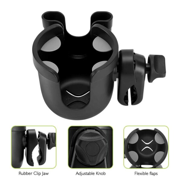 - This 2-in-1 stroller cup holder with a phone holder, it can load drinks bottles and cell phone at the same time. You can see new messages, incoming calls in the first time when you are pushing a stroller or running on a treadmill. It is applicable to most cell phones on the market.
