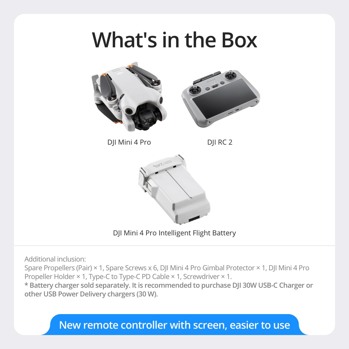 -DJI Mini 4 Pro (DJI RC 2) includes the drone, DJI RC 2 remote controller, one DJI Mini 4 Pro Intelligent Flight Battery, and more. Get precision control with DJI RC 2 featuring a bright screen.