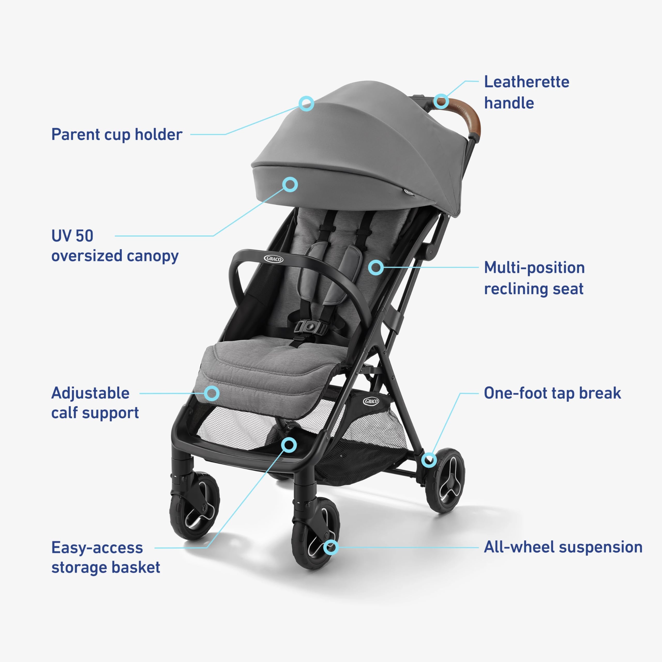 Details: The Graco® Ready2Jet™ Compact Stroller features an automatic, self-fold with one-hand activation that makes it easy to fold and unfold, while its self-standing fold keeps your hands free. Weighing just 13.2 lb—less than two gallons of milk—this compact stroller is fully-featured and ultra lightweight! Experience the added convenience of a collapsible travel stroller that’s overhead friendly* for ultimate portability, making it the perfect airport companion. Your child will ride in comfort with a multi-position reclining seat and adjustable calf support under a UV 50 oversized canopy with visor, while the easy-access storage basket helps keep parent and baby travel essentials in a one safe place. All-wheel suspension ensures a smooth ride. Parents will love the included parent cup holder and stylish leatherette stroller handle. The removable belly bar doubles as a carry handle for even more convenience.