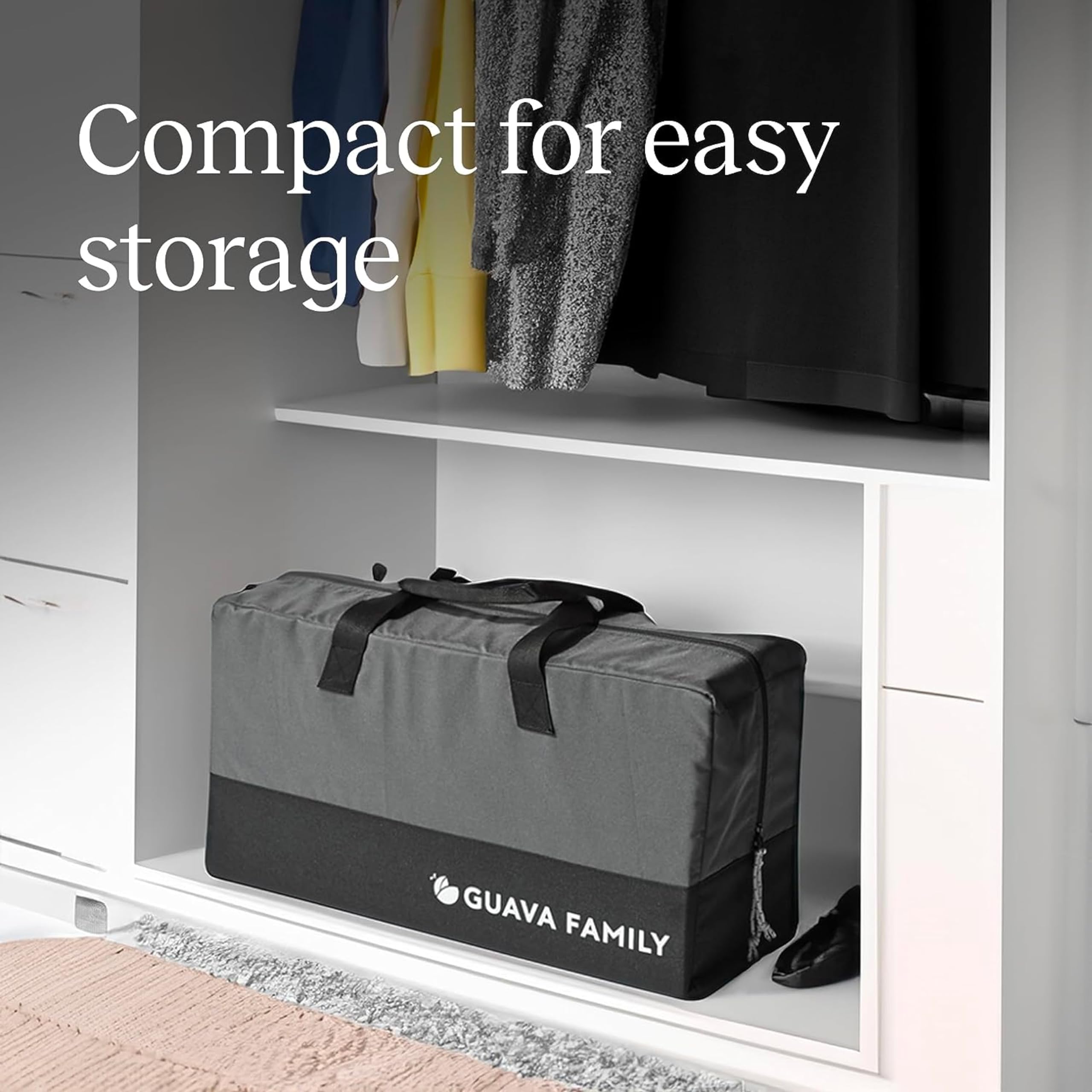 Details: We believe life should be spent together. So we designed a crib to make it easier to do just that. The Lotus is more than a travel crib. It’s an EVERYWHERE crib. So light. So portable. It sets up in 15 seconds. Use it everywhere, everyday. At Home. At friends’ for dinner. At a playgroup. Across town. In the airport. Across the world. And the Lotus travel crib is beautiful. It has clean lines, art-inspired graphics and logos, soft textured fabrics, and modern colors. Easy for You: Since it’s effortless to take the Lotus portable crib with you and super fast to setup, you’ll go more places and see more friends & family. Not just on overnight trips, but all the time at home and across town. And since it’s a lightweight backpack, both hands are available for everything else, including the baby and diaper bag. Guava Family is the only company in the world that makes cribs that pack into backpacks. Fun for them: Nothing makes us happier than to see how much fun the little ones have in the Lotus travel crib. Give them their own way in and out, and they think of it as their world, not a prison. The side door, which can be zipped and secured closed turns the crib into a secure space where they’ll love to play, laugh, sleep. We won’t blame you for climbing in with them either…. Safe For Everyone: No Flame Retardants. No Phthalates. No Lead. Full-side breathable mesh. 16 CFR 1221 + ASTM F406-13A certified. Also, the Lotus Crib cover is removable and machine washable. Spit up. Slobber. Drool. It’s only a matter of time… What You Get: The Lotus Crib comes with the crib, mattress, and bag (with convertible backpack straps), and instruction manual, and our heartfelt thanks for joining the Guava Family!