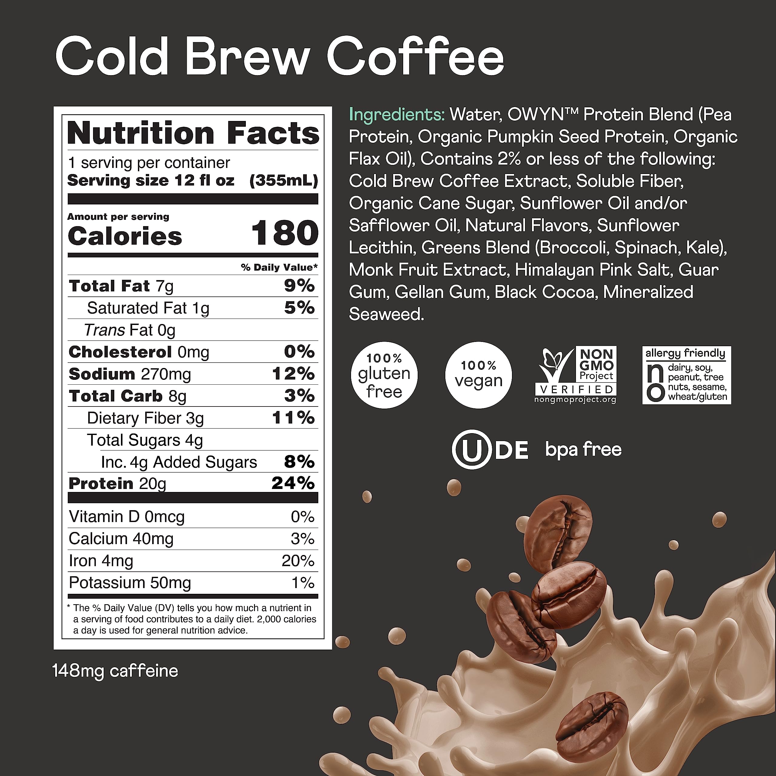 Details: OWYN 100% Plant Protein shakes deliver unbeatable taste, superior nutrition, and the cleanest nutrient profile. This vegan-protein drink combines pea, organic pumpkin seed, and organic flaxseed, so you can benefit from a complete profile of all 9 essential amino acids (the building blocks of protein) which help in maintenance and development of muscle, hair, skin, and nails. Along with 20 grams of protein, each serving delivers a superfoods organic greens blend (Organic Kale, Spinach, and Broccoli) and 535mg Omega 3s, which are known to be anti-inflammatory on the body. Our plant-based protein shakes are tested by two third parties to ensure no top 8 allergen contamination (gluten-free, dairy-free, egg-free, soy-free, peanut-free, tree nut free, no fish, and no shellfish). Keep your goals on track with our non-GMO project verified formula that’s free of anything artificial.